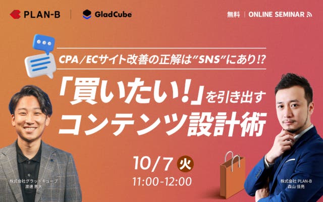 CPA/ECサイト改善の正解は”SNS”にあり!?「買いたい!」を引き出すコンテンツ設計術 日時 2025年10月07日(火) 11:00~12:00 会場 オンラインセミナー 参加費 無料 登壇者 森山 佳亮(株式会社PLAN-B Cast Me!事業部 部長) 渡邊 恵大(株式会社グラッドキューブ プロモーション統括本部 マーケティング DX 事業部 シニアマネージャー) 受付終了