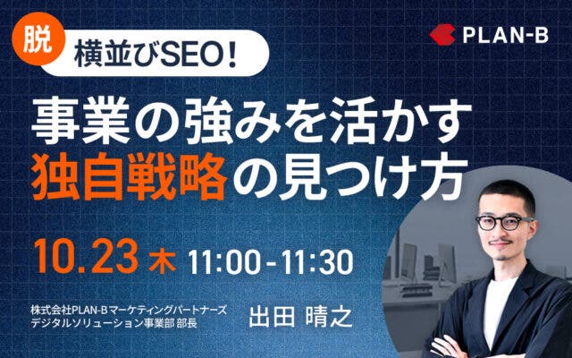 脱・横並びSEO!事業の強みを活かす独自戦略の見つけ方 日時 2025年10月23日(木) 11:00~11:30 会場 オンラインセミナー 参加費 無料 登壇者 出田 晴之(株式会社PLAN-Bマーケティングパートナーズ デジタルソリューション事業部 部長) 受付終了