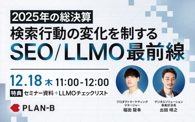 【2025年の総決算】検索行動の変化を制するSEO/LLMO最前線 日時 2025年12月18日(木) 11:00~12:00 会場 オンラインセミナー 参加費 無料 登壇者 出田 晴之(株式会社PLAN-Bマーケティングパートナーズ デジタルソリューション事業部 部長) 福田 龍幸(デジタルメディア事業部 第一ADコンサルティングユニット コンサルティンググループ) 受付中