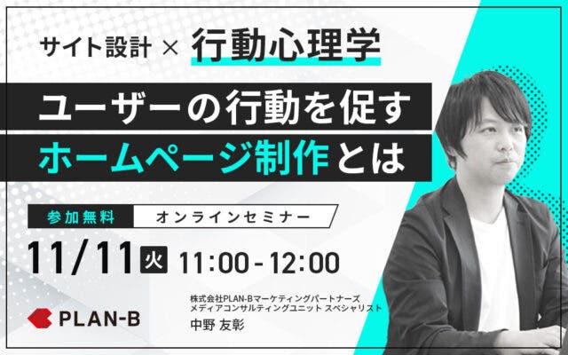 【サイト設計×行動心理学】 ~ユーザーの行動を促すホームページ制作とは~ 日時 2025年11月11日(火) 11:00~12:00 会場 オンラインセミナー 参加費 無料 登壇者 中野 友彰(株式会社PLAN-Bマーケティングパートナーズ デジタルソリューション事業部) 受付中