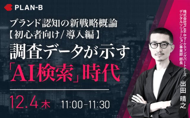 【初心者向け/導入編】調査データが示す「AI検索」時代。ブランド認知の新戦略概論。 日時 2025年12月04日(木) 11:00~11:30 会場 オンラインセミナー 参加費 無料 登壇者 出田 晴之(株式会社PLAN-Bマーケティングパートナーズ デジタルソリューション事業部 部長) 受付終了
