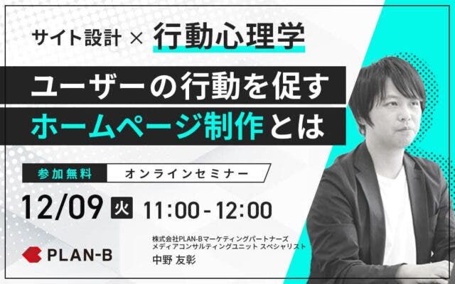 【サイト設計×行動心理学】 ~ユーザーの行動を促すホームページ制作とは~ 日時 2025年11月11日(火) 11:00~12:00 会場 オンラインセミナー 参加費 無料 登壇者 中野 友彰(株式会社PLAN-Bマーケティングパートナーズ デジタルソリューション事業部) 受付終了