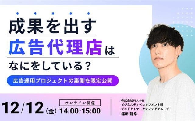 成果を出す広告代理店はなにをしている? -広告運用プロジェクトの裏側を限定公開- 日時 2025年12月12日(金) 14:00~15:00 会場 オンラインセミナー 参加費 無料 登壇者 福田 龍幸(デジタルメディア事業部 第一ADコンサルティングユニット コンサルティンググループ) 受付中