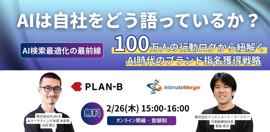 本ウェビナーでは、SEOおよびAI検索対策の実務に精通した株式会社PLAN-Bと、100万人規模のLLM利用データを保有する株式会社インティメート・マージャーが登壇(登壇者に関してはお申込みページをご確認ください)