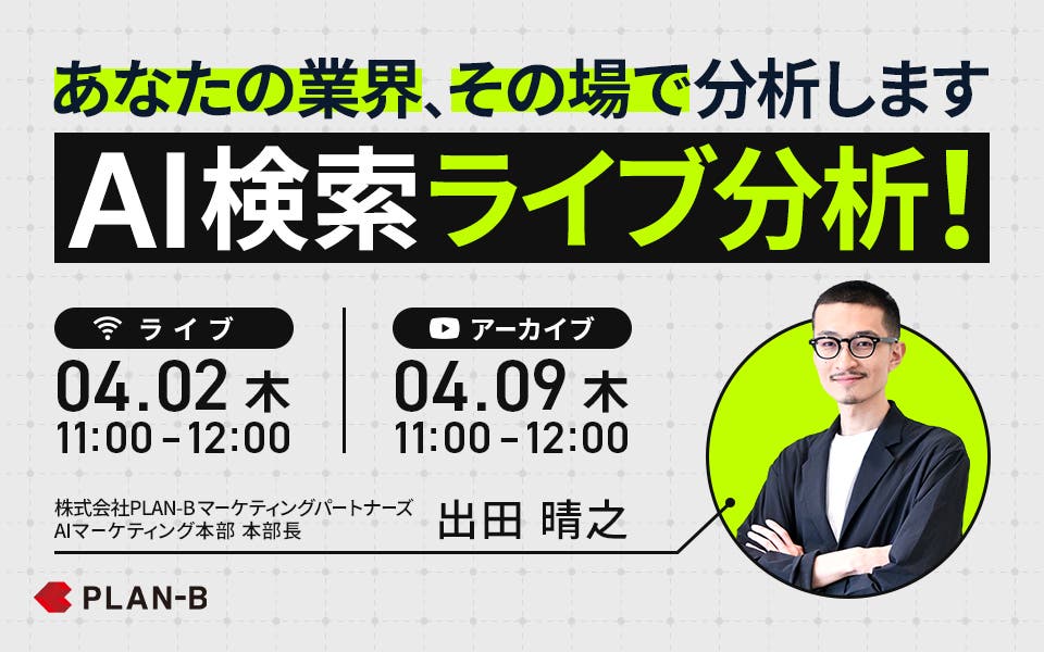 そこで今回、PLAN-BのAIマーケテイング本部長が登壇し、Ahrefsを使って参加者様の気になる業界・商材をその場でAI検索状況のライブ分析を行うセミナーを開催します。