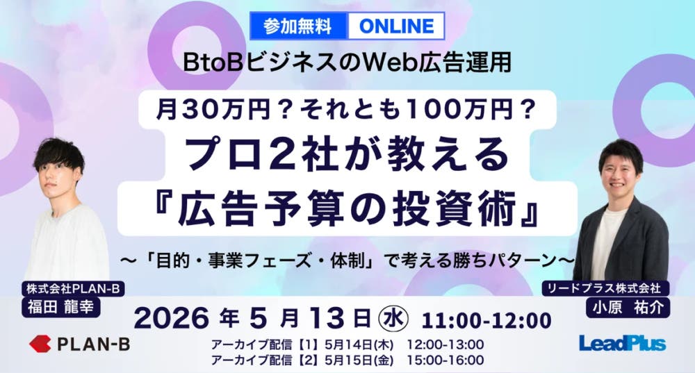 BtoB企業のマーケティング担当者様が常に抱えるこの悩みに、Web広告の支援実績が豊富な株式会社PLAN-Bとリードプラス株式会社がディスカッション形式で切り込みます。